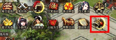 1.只有您的君主等级达到70级,系统才会为您开启神兵系统。点击界面上方的“神兵”按钮,即可进入神兵系统界面。