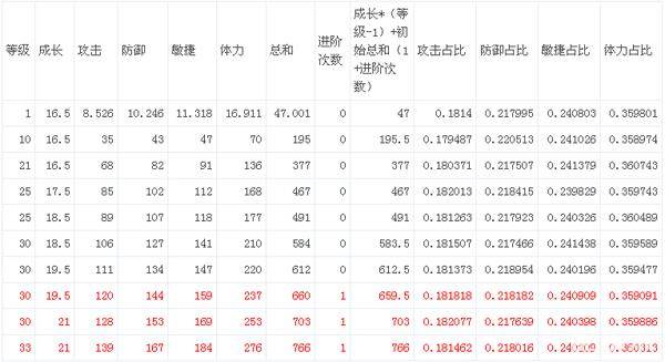 1、武将初始4维(攻击、敏捷、防御、体力)各自占的比重不会随着等级、成长变化而变化