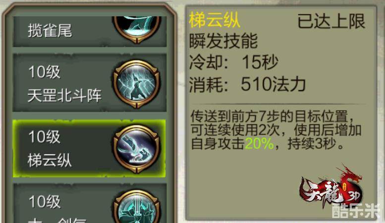 技能强化能让该技能从两段释放变为一次性释放,但是距离超远;3层天赋也可以选择在梯云纵之后提升移速,20级天赋提供额外100%移速。