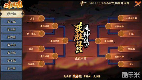 然后说一下分组,参加忍战的组织一共为前128个活跃的组织,分为两个大组来比赛,每个大组又分为8个小组,两个大组分别为风神组和雷神组,第一场正常分组打,第二场为赢得和赢得打,输得和输得打。 第二场完事之后,赢得晋级等待周六的4进2,而输得重新分组打友谊赛。