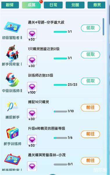 成就任务,当你完成某些特性的事情之后就会达成的任务,目前有通关普通副本,通关精英副本,训练师等级提升,精灵图鉴等级提升,多种精灵图鉴等级提升,融合次数等任务,完成任务可以获得大量的钻石奖励。
