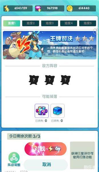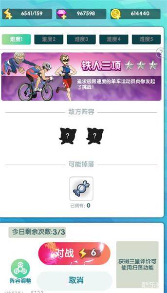铁人三项副本,可以获得精灵升级的材料经验糖果,每天有免费的次数,免费的次数是所有难度通用的,挑战的时候需要消耗挑战次数和体力,挑战次数用完了之后,还可以购买,直到购买上限。通关三星之后可以进行副本扫荡,敌方的阵容也会显示出来。