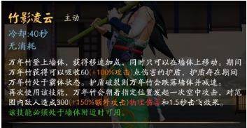 5、大招“竹影凌云”:该技能必须处于墙体附近时使用,可登上墙体,获得移速加成。同时,万年竹还能获得一个能吸收伤害的护盾,护盾存在期间万年竹免疫控制,若护盾破裂则万年竹会跌落墙体并减速。