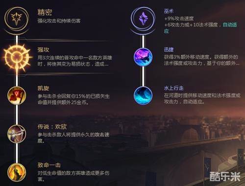 主系精密带强攻、凯旋、欢欣、致命一击,副系带迅捷和水上行走,这套符文极大地保障了雷克塞在野区1V1的强势和游走抓人的速度。