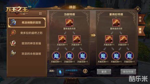 神器碎片全部解锁后,会有神器特质,而神器特质可以提升对应的天赋等级。每一层只能激活一个神器特质,激活后将不可更改,而神器特质又决定了可以获得的天赋,所以需要玩家根据自身的职业定位来进行取舍。如果对获得的神器特质不满意,可以通过重铸来进行更改。神器重铸需要消耗一定的祝福精华道具,不同的神器所需要的祝福精华也不同。比如弗洛纳斯的宽恕需要水神祝福精华来进行重铸、奥多拉的盛然之怒则需要火神祝福精华来进行重铸、提洛的神圣祝福则需要光神祝福精华来进行重铸。