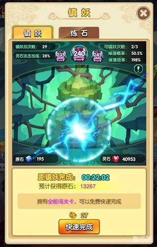 当然,镇妖如此强大的功能,每天能进行的次数是有限的。目前版本中,每天镇妖的次数最多3回,炼石的次数最多1回,大家一定要善用哦~由于镇妖是根据自己当前的关卡数来计算所得原石的,所以记得至少要在一天最后下线前镇妖一次。而炼石需要的时间相对较长(根据炼石数量决定,数量越多时间越长,但收益可观),可以充分利用不在线的时间进行。