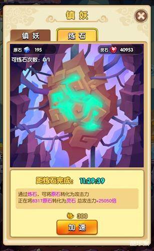 所谓“镇妖”,其实就是自动从头开始把所有打败过的头目重新击败一次,从而彻底击败这些妖怪,同时还能重新从头目身上获取掉落的重要资源“原石”。原石的掉落也和普通闯关时一样,受各种相关加成影响。原石的作用可是非常大的,而且还不止一个用途。用途之一就是直接转化为葫芦娃的攻击力加成,而这个过程就是镇妖中的第二大功能——炼石。