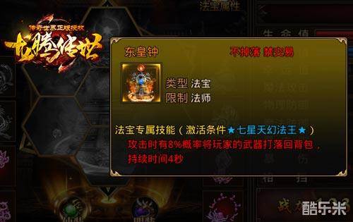 神灵幻化,亦梦亦幻,真假难辨。但不管真假,玩家都需要认真对待,因为神灵本尊也可能混在一群幻象当中。玩家击退幻象,幻象化作缥缈;一旦击退本尊,则有机会得到轩辕法宝“东皇钟”的碎片。集齐一定数量的碎片就能激活吞噬诸天的法宝“东皇钟”,在游戏中该法宝能让人物附带攻击特效,攻击的时候有8%的概率将对方武器打落回背包,简单来说就是一种“缴械”效果。