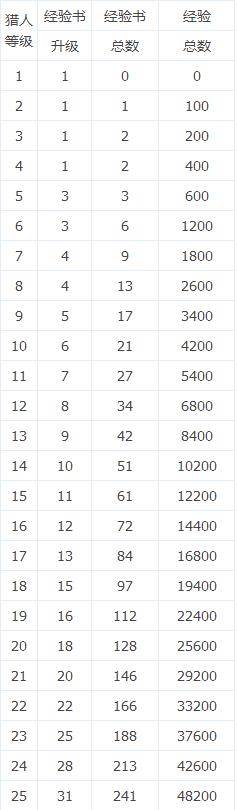 怪物猎人开拓记猎人目前最高是60级,那么每升一级需要多少经验值和经验书呢?下面就一起来看看小编为大家统计的怪物猎人开拓记猎人等级经验表。
