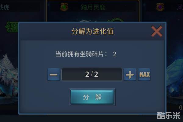 初始的坐骑有3种品质,高低依次为紫-蓝-绿。多余的坐骑碎片可以分解为进化值,然后用来进化坐骑。