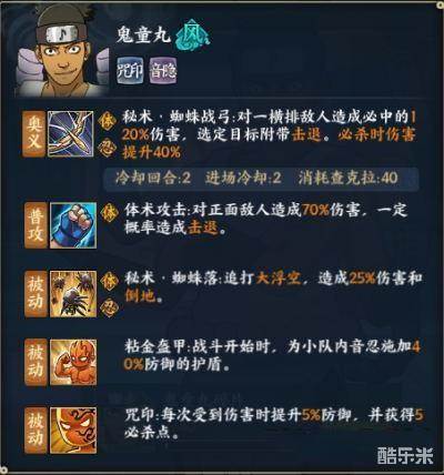 技能点评:虽然被动的名字和君麻吕的一样,但是君麻吕是在忍术、体术、防御、抗性中随机提升10%,而鬼童丸则是专注防御提升。