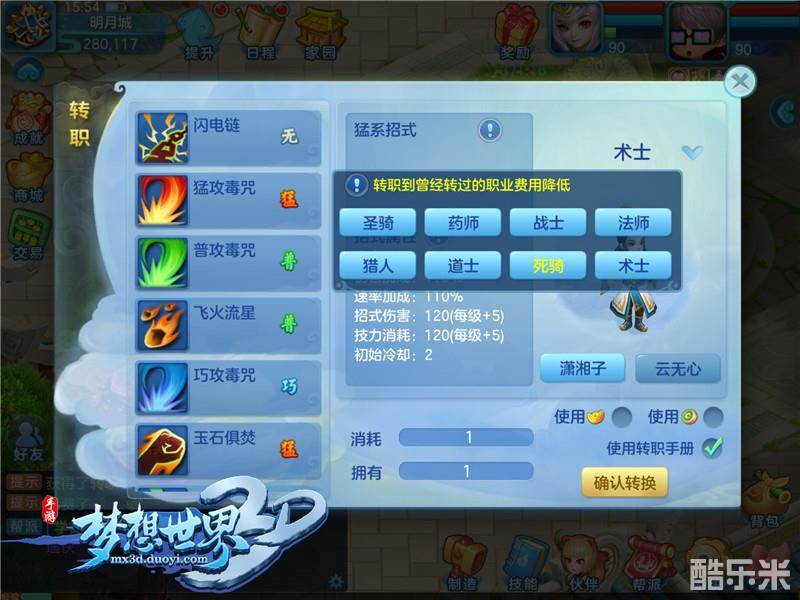 少侠在明月城转职使者(279,114)处可以购买转职手册享受首次转职优惠,活动期间,只需要花费五折金币价格或梦想币即可购买转职手册抵用一次转职费用。除此之外,下调了转到曾经转过职业的价格,转职后保存当前转职的翅膀和小精灵配置,再次转职时可以在保存方案中切换,对于喜欢体验不同职业的少侠来说可以说是优惠福音了。