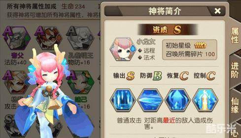 天域幻想小龙女远攻神将资质属性解析,小龙女-让我来结束这一切吧!前排利器,伤害集中,瞬发出招,下面我们就来详细具体的了解下这个神将的属性吧。