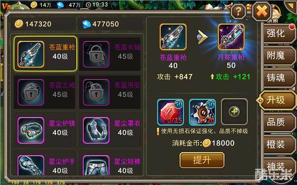 攻击套装和防具套装需要的升级材料不尽相同,攻击套装需要攻击魔石和机械零件,防具套装需要防御魔石和机械零件。此外,在升级为50或更高级的装备时需要注意,提升装备等级是有几率损失强化星级和品质等级的,最好备好对应等级的无损石才进行升级。