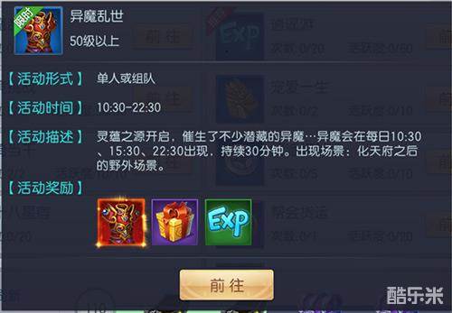 在主界面的右上角选择“活动”——“异魔乱世”,选择“前往”或者在组队界面的目标中选择 “异魔乱世”即可进入。异魔乱世作为游戏中的一个副本,在角色等级达到50级以上才会开启,仙家们合力击败异魔将会获得神装和妖灵宝箱。