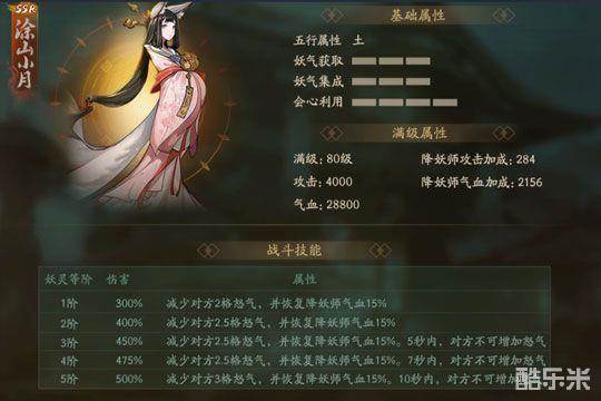 1、涂山小月的攻击面板非常低,血量倒是挺厚,达到了28800,妖气获取、妖气集成、会心利用也是很普通,没有什么亮眼之处,但是满级技能可以减boss3格怒气,并恢复降妖师15%的气血。十秒之内对方不可增加怒气。