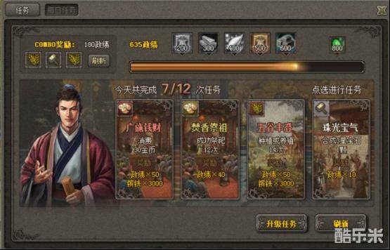 做对应图标的任务即可完成combo,不同颜色的任务有不同政绩收益。