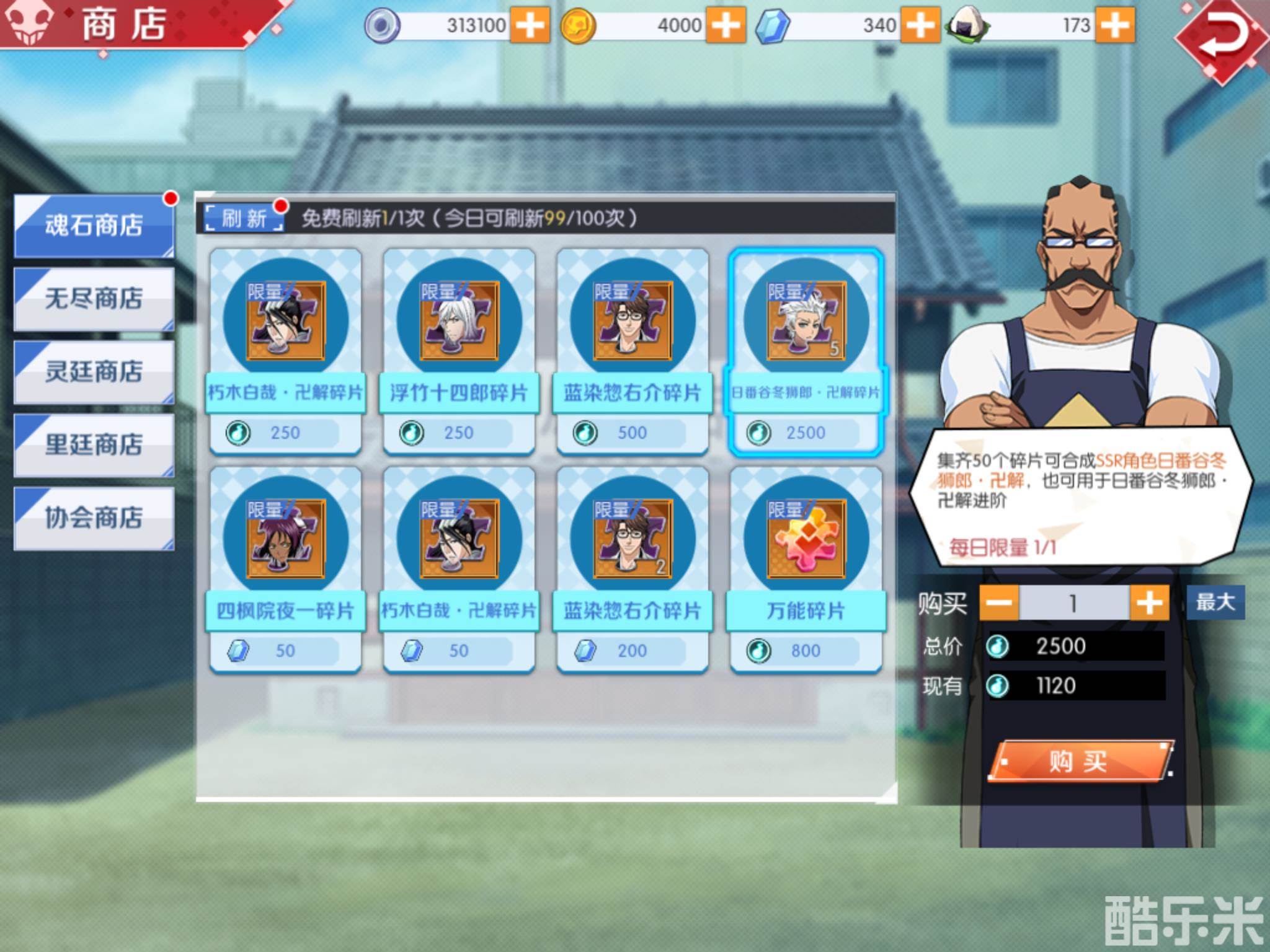 还有就是商店了,商店中玩家可以根据自己需求来自行购买自己需要的碎片,普通的碎片能够直接合出人物,卍解碎片能够合出卍解后的人物,也可以用于进阶,同时碎片还可以从各种活动以及剧情中获得。