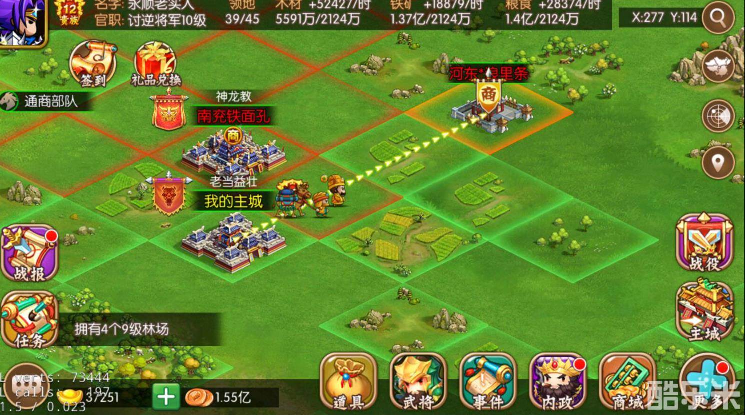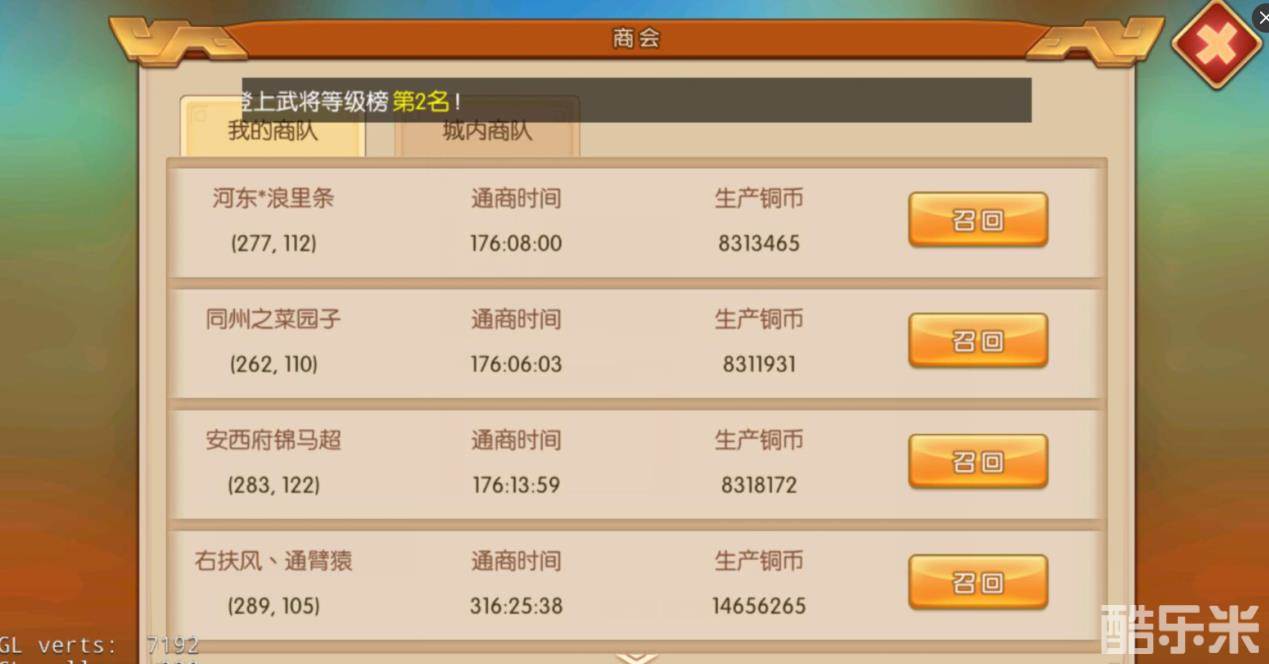 3、有了商队之后,你可以在野外地图把商队派遣出去。不管是盟友的主城还是敌人的主城都可以派遣商队进行通商,通商过程中你的商队将会根据通商时间赚取铜币,你可以在商会界面里下达命令召回商队,等到你的商队回到你的城里的时候你的商队赚的钱就到你账上了。