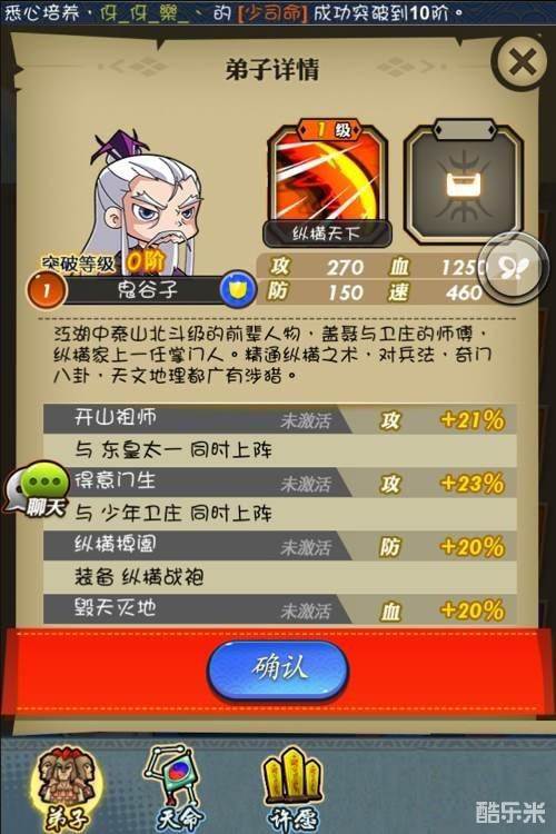 技能——纵横天下:鬼谷子领悟纵横之道所创的必杀技,兼具纵剑的锐气与横剑的霸气,一往无前,势不可挡。触发几率低,范围敌方全体。技能效果:敌方每死亡一个单位,纵横天下的伤害提高5%。