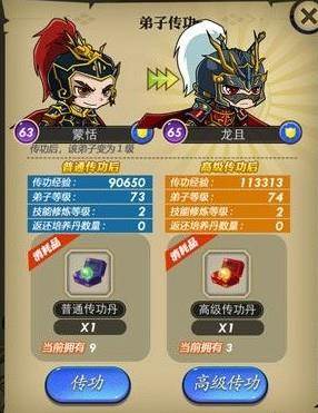 弟子传功需要消耗传功丹。传功丹分为普通传功丹以及高级传功丹两种,普通传功丹可传递弟子80%的经验,而高级传功丹则可以全额传递弟子的经验值,即便是高人点拨增加的经验也可以全额传递哦。