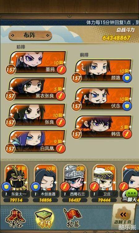 2、这套阵容很硬的误区。这套阵容总的来说除了伏念颜路,其他和三极纵横屠龙一样的脆皮。韩信前排防御是个大问题,毕竟缺乏防缘,不过好在这套阵容基本也就两轮解决问题,不需要站太久,否则的话就只能悲剧了。