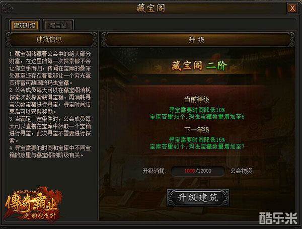 本次更新中,《传奇霸业》新增公会建筑-藏宝阁,开服60天后,打开公会-建设界面,消耗一定数量公会物资即可解锁。