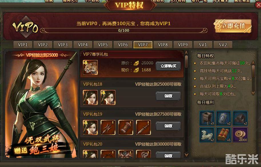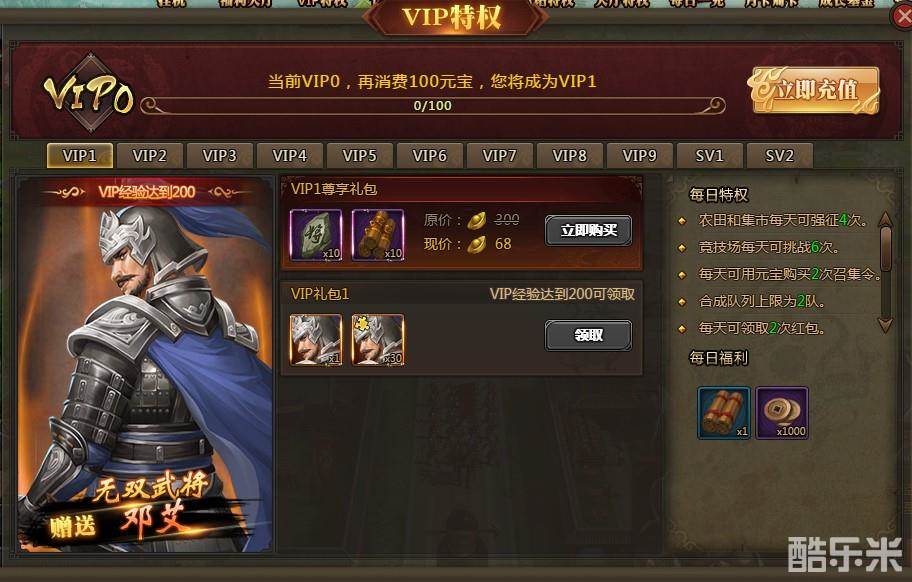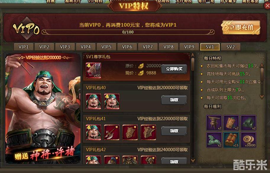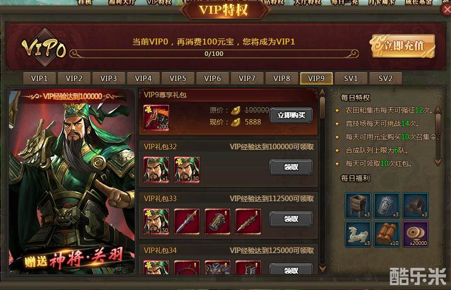 1、VIP礼包:每个VIP等级有多个礼包,可直接领取稀有道具(无双/神话武将、专属坐骑、升星石、突飞令等)