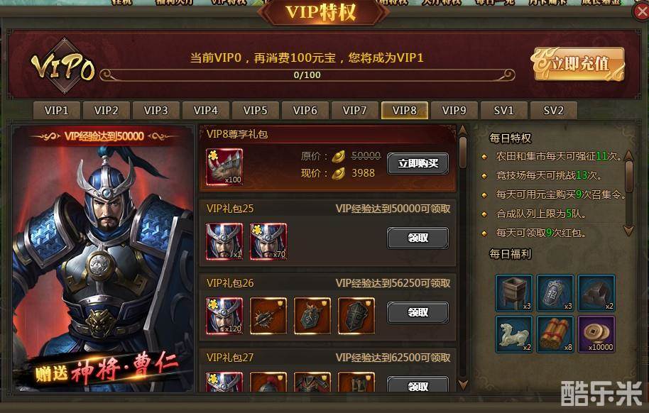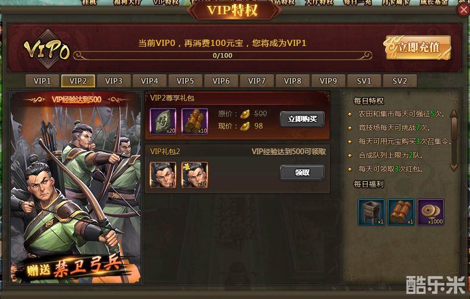 每日更多的农田和集市强征次数、竞技场挑战次数、元宝购买召集令的次数、领取红包次数,更高的合成队列上限和太学研究科技队列上限。