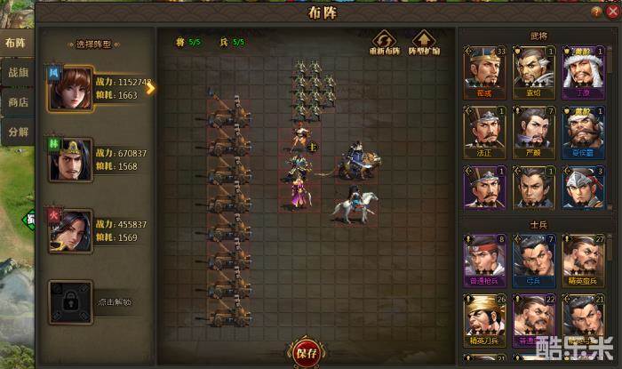 拖拽右侧列表中的武将士兵到左侧布阵区域即可完成上阵