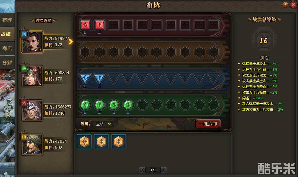 拖拽战旗来进行配置,战旗只能放入对应颜色的格子中