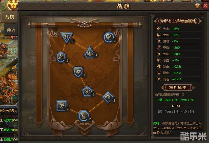 战旗中所获得的能力提升将为所有士兵增加属性,每种能力均可进行升级,升级后士兵所获得的属性也将相应加强。当九种能力同时达到某一等级时,将激活额外属性,共同等级越高,能获得的额外属性也越多。