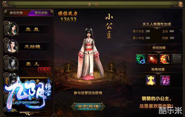 在游戏中,最常见的美人就是侠侣。因为《九阴绝学》的每位玩家都会配备一名侠侣,无论上天下海,侠侣将无条件追随玩家,至死方休。侠侣不仅是玩家的伴侣,还是强大的战斗助手。