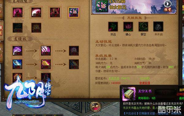 3、可用元宝在商城购买无字天书,只要有充足的元宝,可更快升级武学技能。