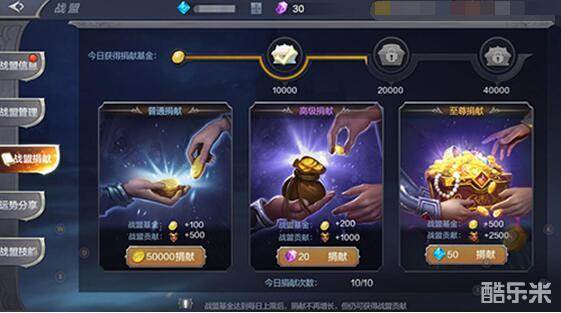 或者我们也可以更灵活一点,使用结合型的捐献方法。我们可以不用十次都使用一个等级的捐献,可以使用五次高级捐献五次至尊捐献类似这样的捐献方法。这里推荐大家一个捐献方法,那就是使用三次普通捐献五次高级捐献和两次至尊捐献。这样捐献,一来玩家消耗的资源都是整数方便计算,利于玩家更好的使用自己的资源,二来消耗的资源比较低,大部分玩家都能够消费的起,三就是奖励比较丰厚,累积有2300战盟基金11500战盟贡献,无论是为战盟累积基金还是为个人累积战盟贡献,都是比较不错的。
