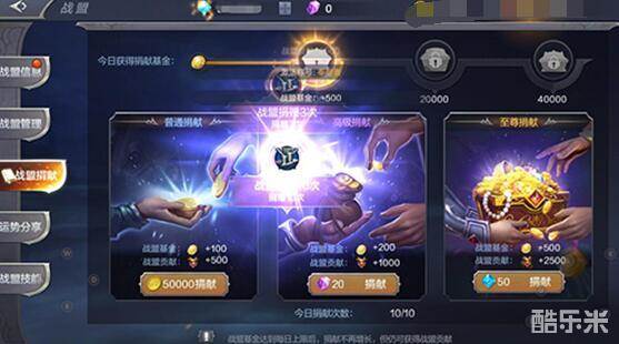 战盟捐献是获得战盟基金和战盟贡献最简单最快速的方法。战盟捐献有三个级别,分别是普通捐献、高级捐献和至尊捐献,普通捐献每次消耗50000金币战盟基金+100战盟贡献+500,高级捐献每次消耗20粉钻战盟基金+200战盟贡献+1000、至尊捐献每次消耗50钻石战盟基金+500战盟贡献+2500。玩家每天有10次捐献机会,不管什么等级的捐献都消耗一次捐献机会。如果当日内战盟获得的捐献基金达到10000、20000、40000时还可以分别获得两个祝福宝石、五个祝福宝石和五个灵魂宝石奖励。