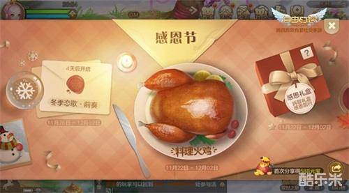 《自由幻想》手游“感恩节”主题活动,由“感恩节合集”、“收集料理&料理火鸡”和“料理火鸡”三大活动组成,压轴的“冬季恋歌*前奏”活动也将同步开启。活动期间,玩家参与任一活动,均能获取大量的游戏道具等奖励,更有爱神宠物卡、1000元宝、永久称号等重磅惊喜!