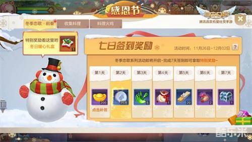 更让人惊喜的是,玩家点击“感恩节”活动主页不断抖动的礼盒,还能100%直接领取感恩节特别奖励,“感恩有你”永久称号、告白气球、我们的公式、灵诀碎片等奖励全部收入囊中。若玩家参与“冬季恋歌活动”的签到活动,还能额外解锁每日签到福利;签到满7天,玩家就能获得最终大奖“冬日暖心礼盒”—— 元宝x1000,3级宝石盒子x1,精制桃花饼x20,爱神宠物卡x3,一口气全部领取,轻松赚的钵满盆满。