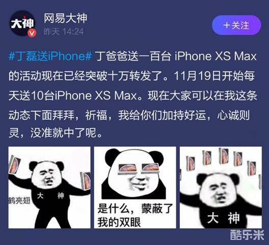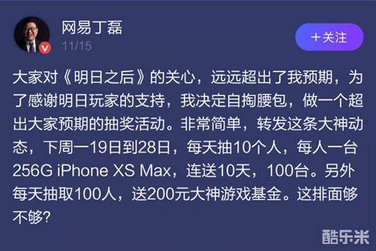 网易CEO丁磊为了感谢玩家们对末日生存手游《明日之后》的支持,亲自掏腰包在网易大神号进行抽奖,从11月19日到11月28日,转发这条大神动态每天抽10台iPhone XS Max,一共100台,另外每天抽取100个人送200元大神游戏基金。