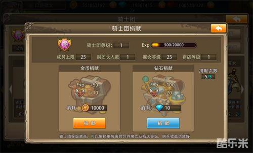 每个骑士团的建设离不开团队成员的每日的捐献,团队成员每天可以使用金币或者钻石进行资源捐献,捐献可增加骑士团的经验等级并且还能获得一定量的骑士币哦!在骑士团商店中使用骑士币可以兑换部分稀有道具。