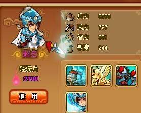 《可乐三国》中目前武将共11种,到了55级赵云就出世了。赵云优点是输出高、速度快,攻击范围大,是最强骑兵之一。