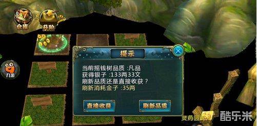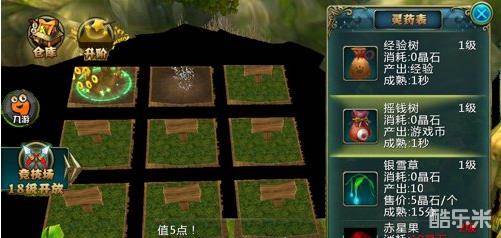 右边显示的便是可种植选项。摇钱树和经验树一天只能种一次,而且是1秒成熟,即刻收获。