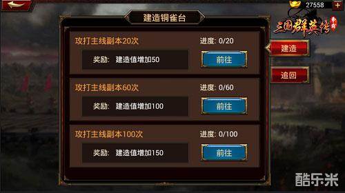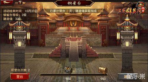 同时,使用完当天的登台次数后,主公们还可以进行建造任务,完成“夺宝次数”、“今日获得联盟功绩”等要求后赢得建筑点数,点数达标即可为铜雀台升级。而建造值达到指定标准还有丰厚建造宝箱可以领取呢。值得一提的是,升级铜雀台可是相当有用的呢,随着铜雀台的等级提升,主公每日登台的次数会相应增加,随之附加的登台奖励也会更好。需要提醒各位,每次铜雀台开放期仅有一个月,大家行动要快啊!
