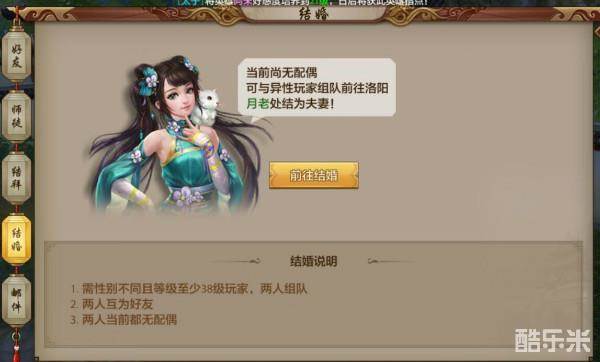 首先玩家需要等级达到38级才可以参与结婚玩法,想要进行结婚的两位玩家,需要性别不同,互为好友,两人当前都没有配偶。然后组队到洛阳月老处结为夫妻。