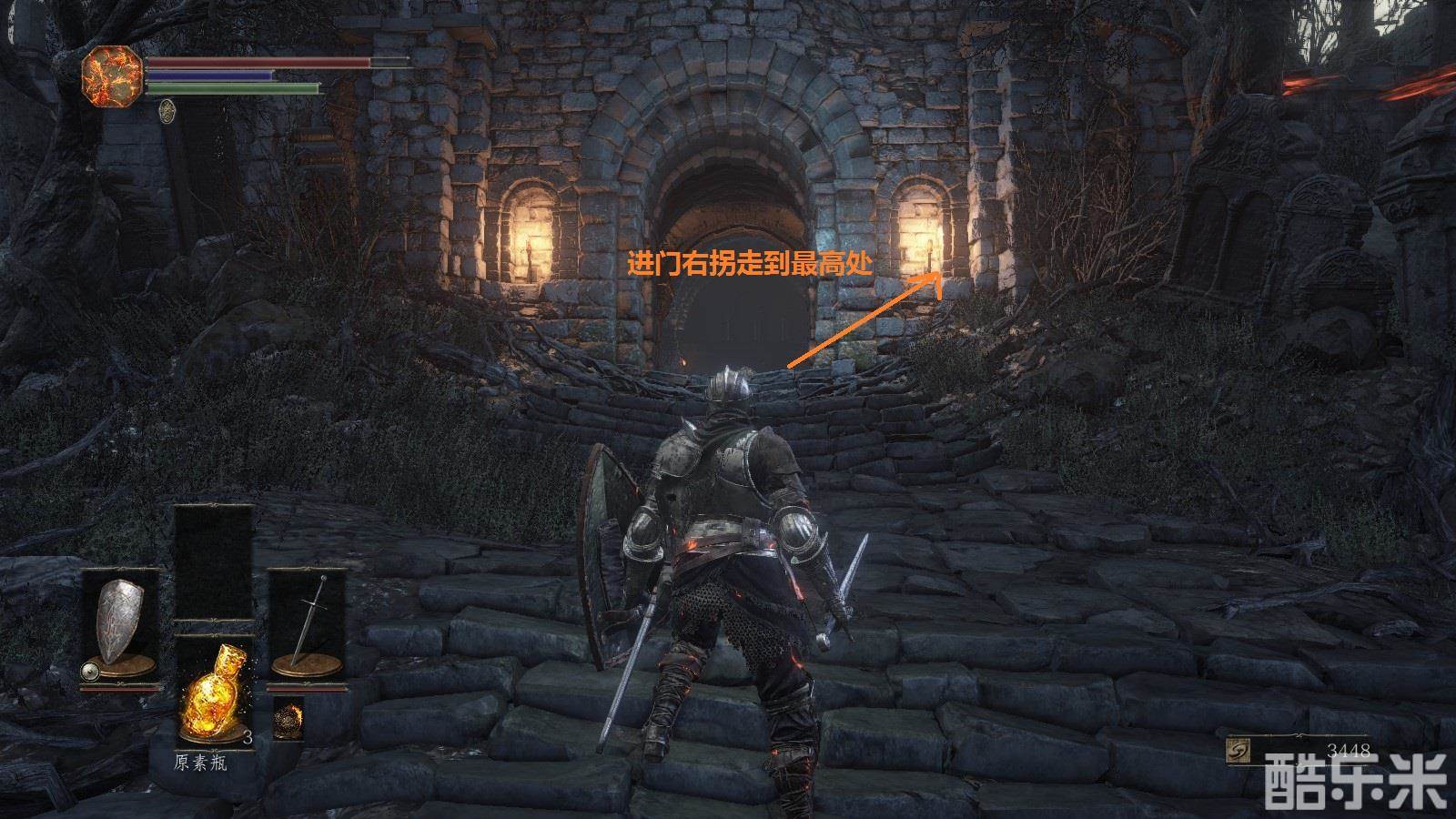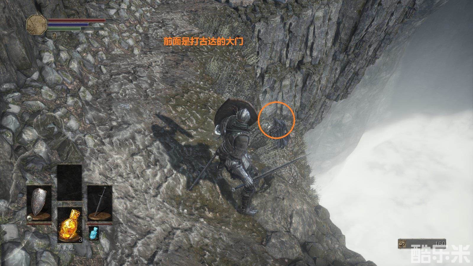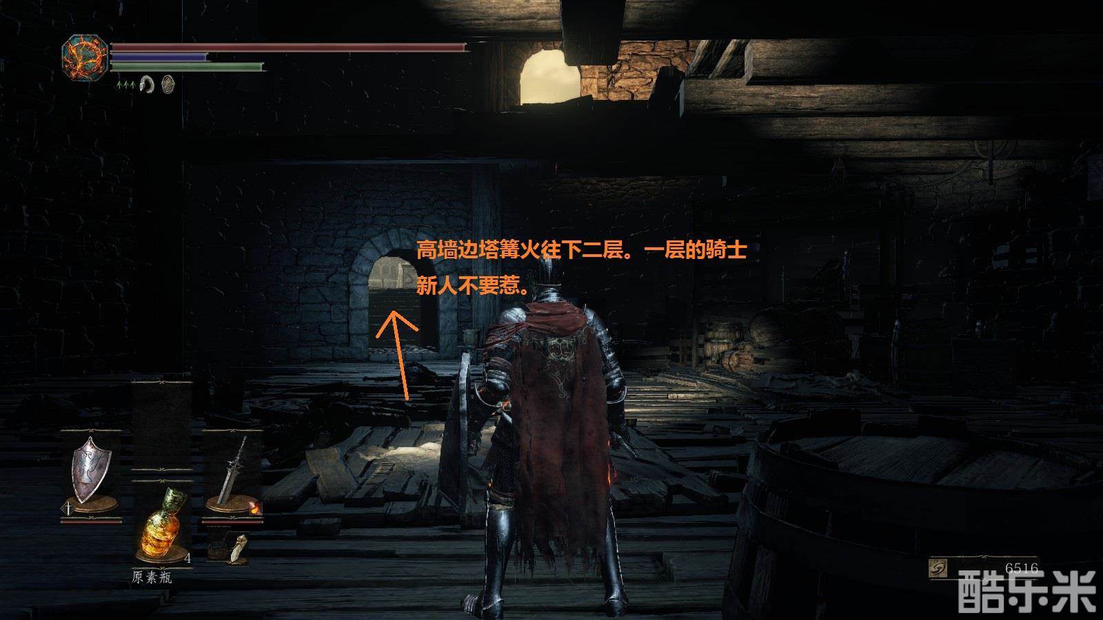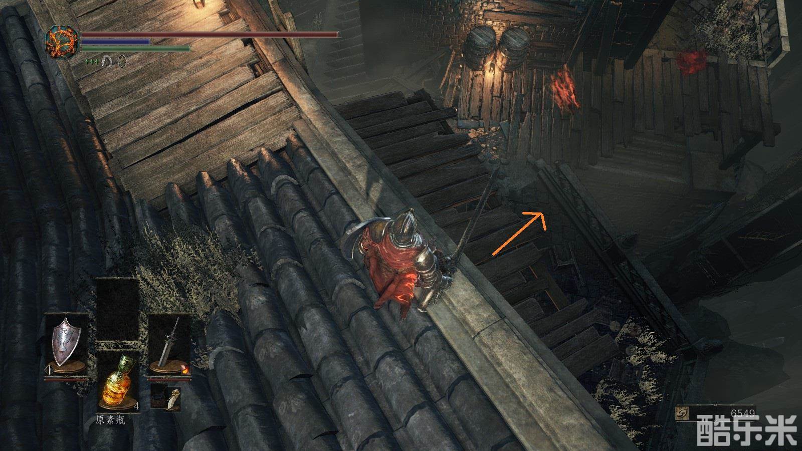 注意:注意绿条,绿条空了就不能进行跳跃,攻击,举盾格挡。火药壶从图中位置获得。