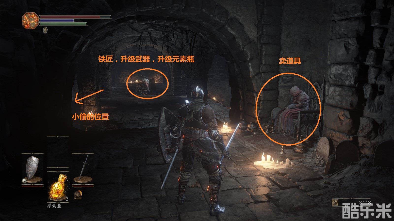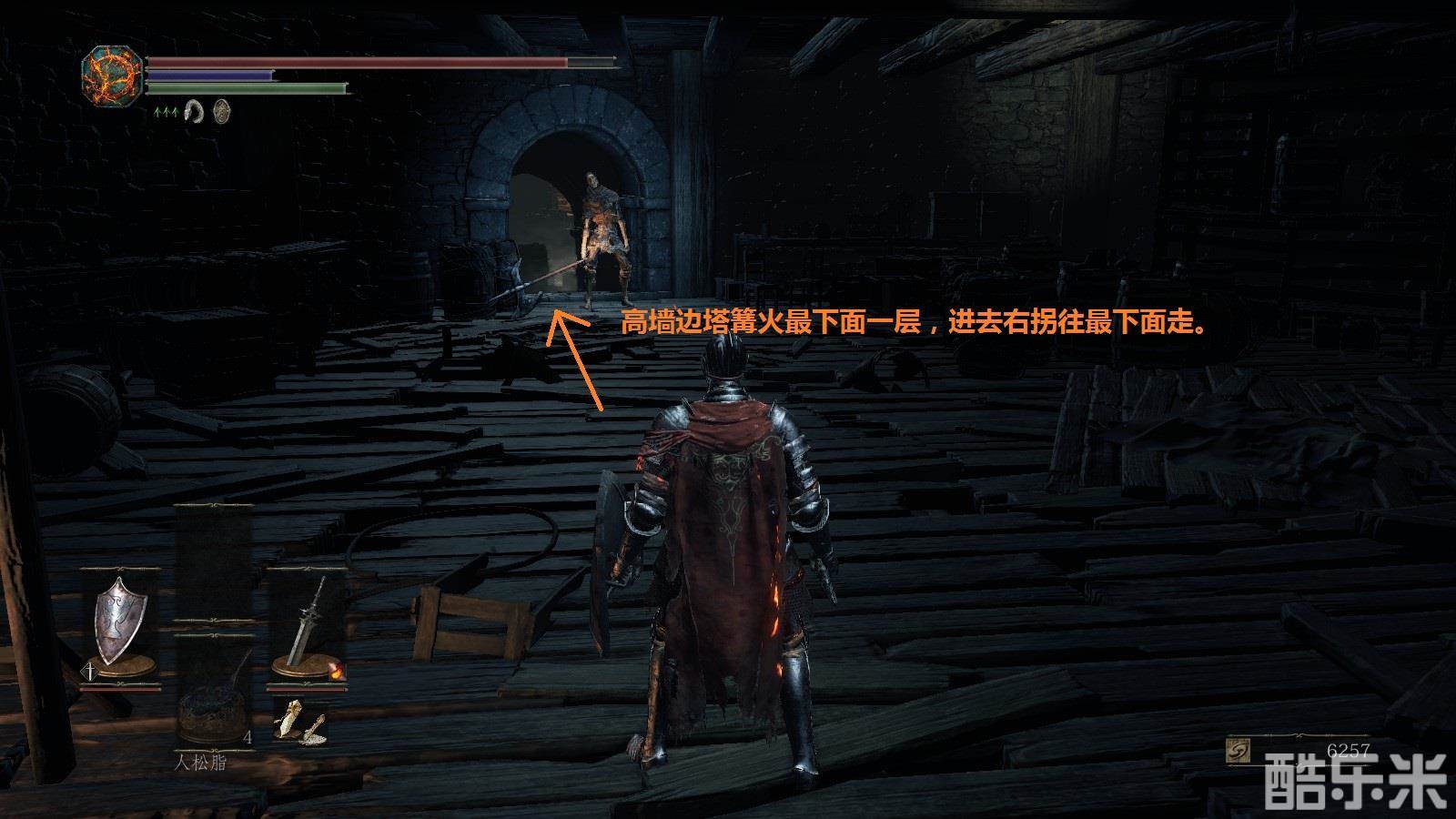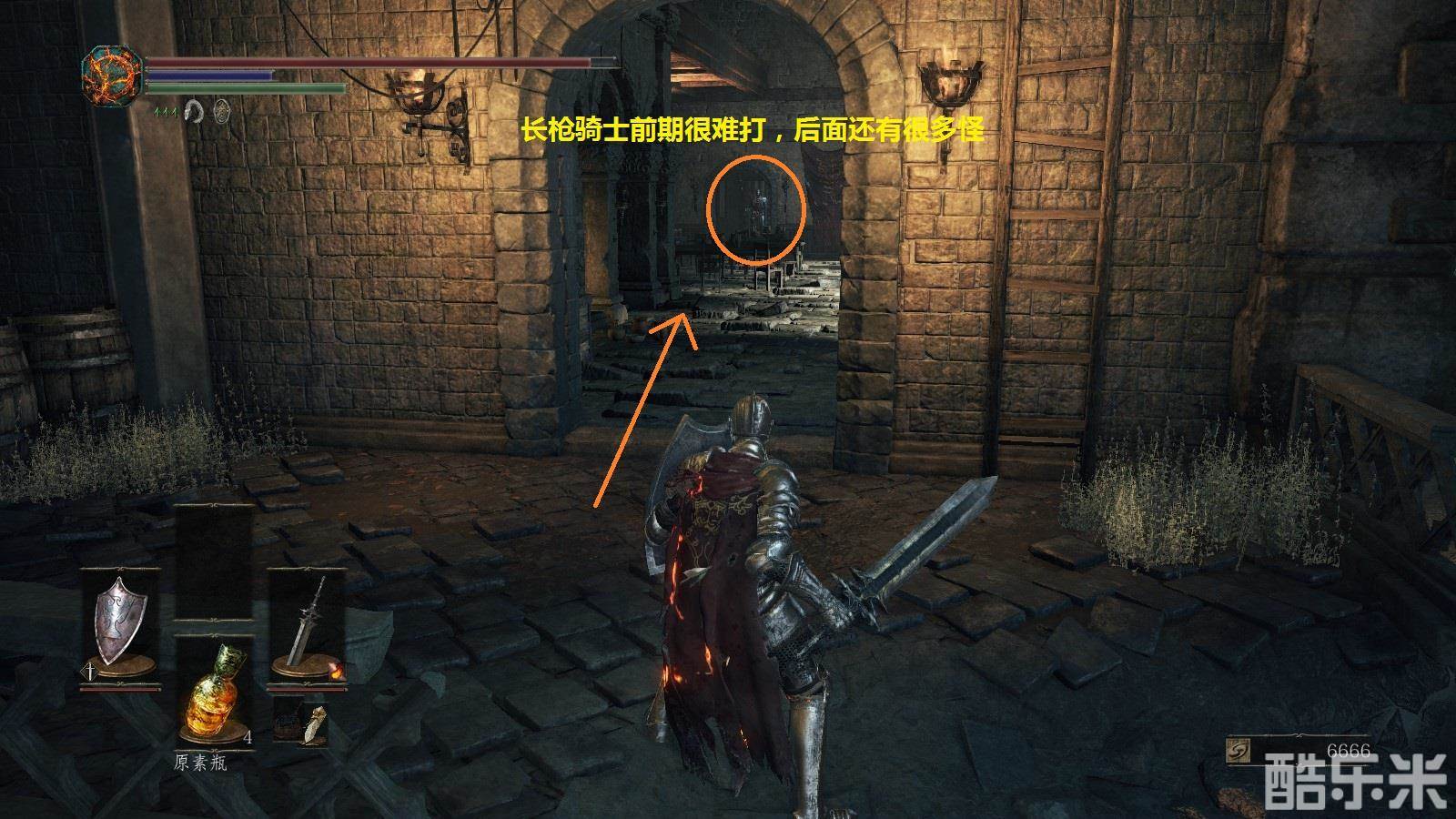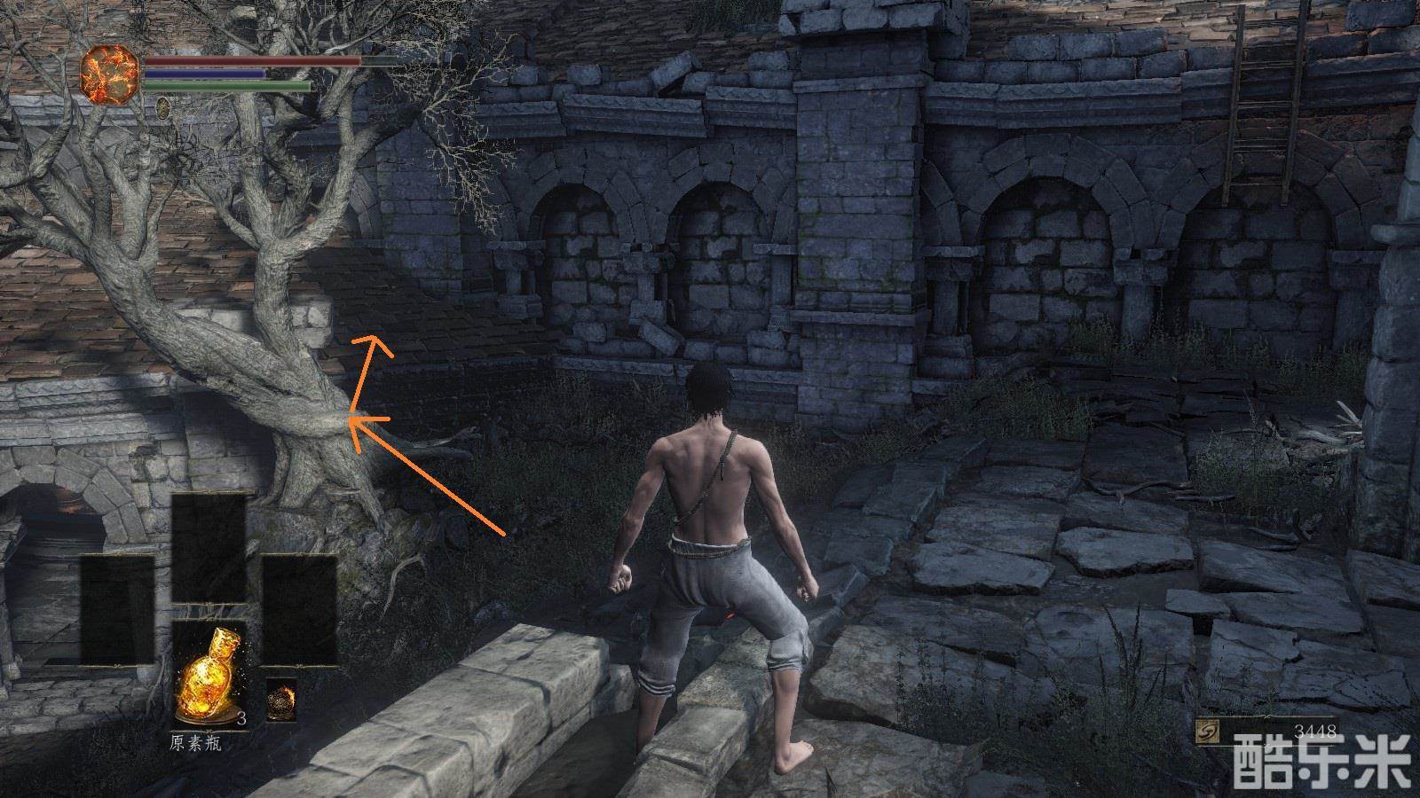 注意:注意绿条,绿条空了就不能进行跳跃,攻击,举盾格挡。火药壶从图中位置获得。