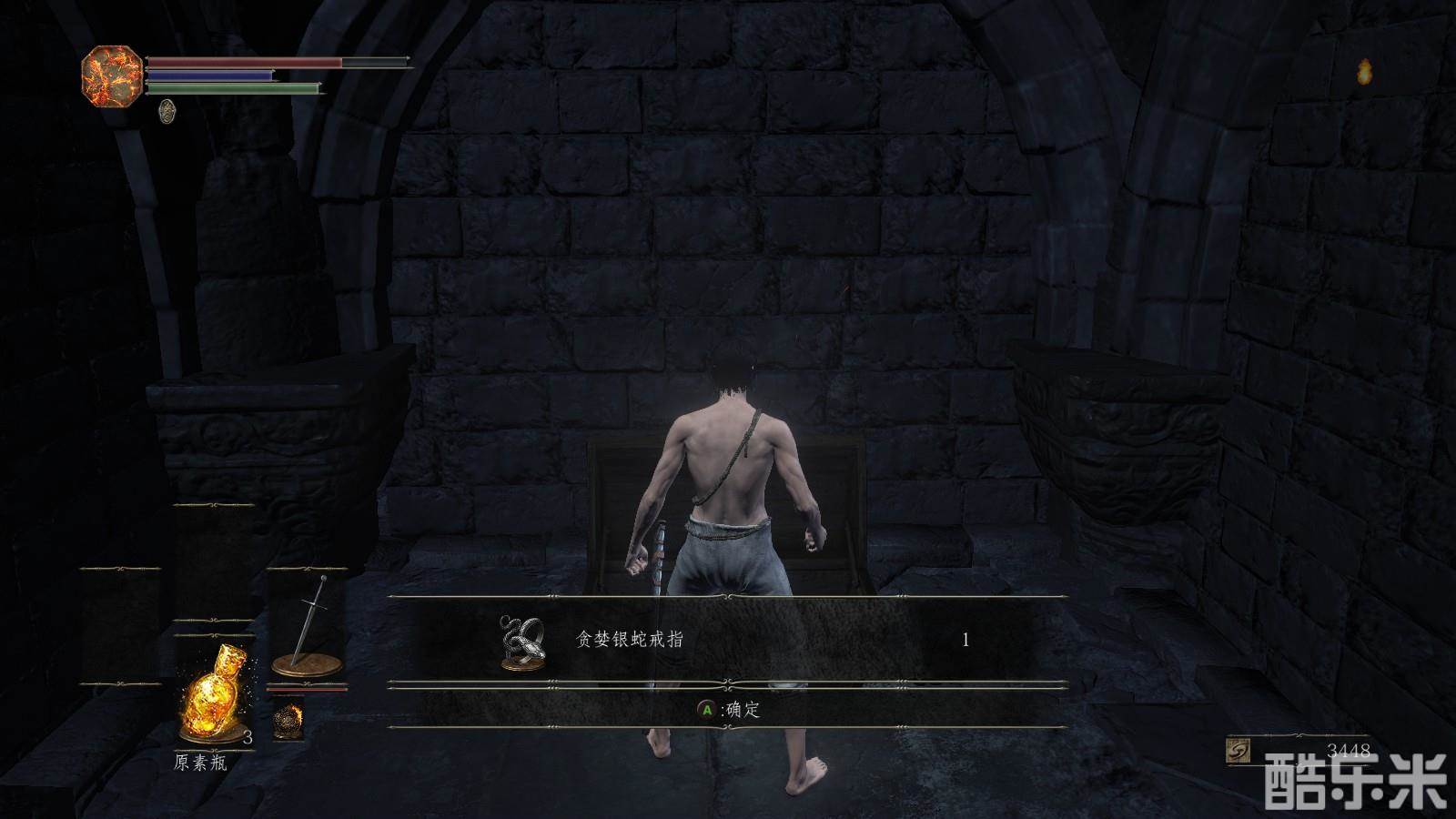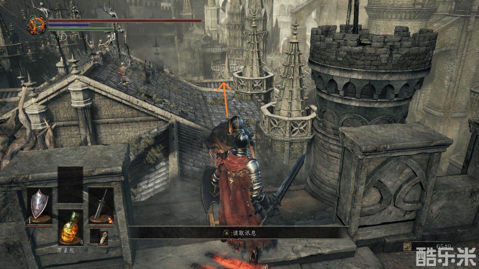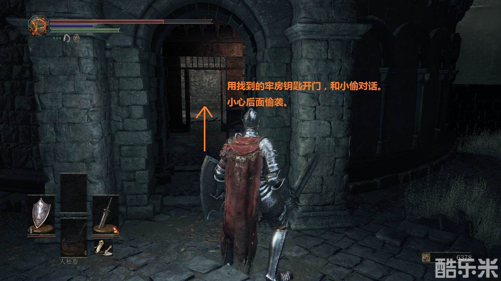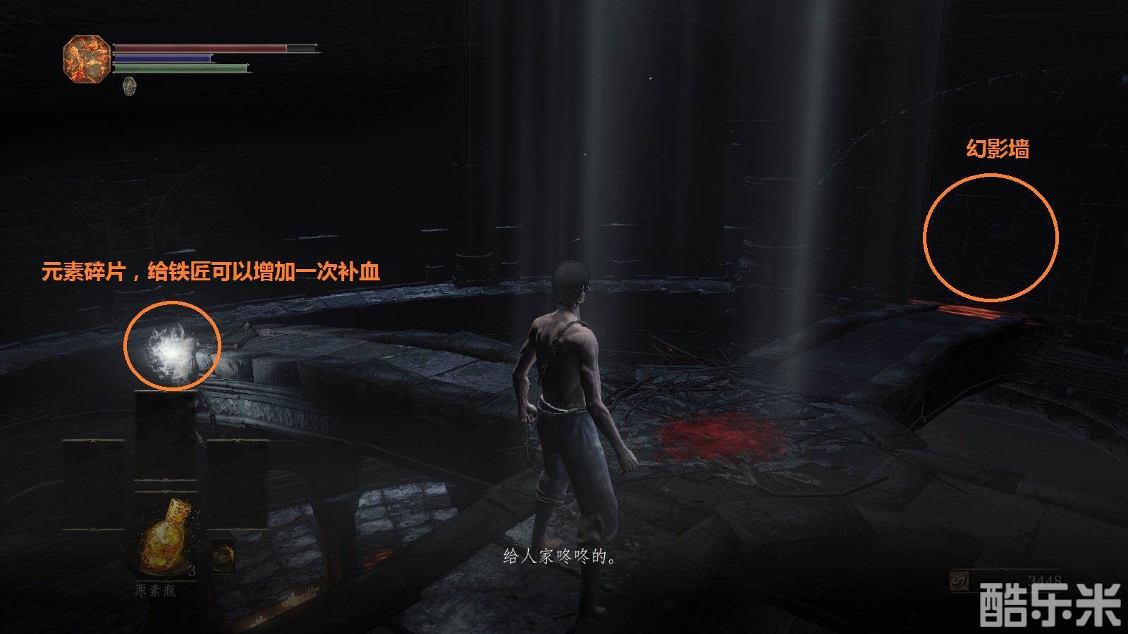 注意:注意绿条,绿条空了就不能进行跳跃,攻击,举盾格挡。火药壶从图中位置获得。