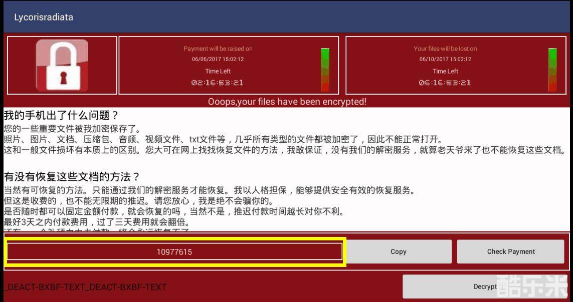 目前腾讯游戏安全中心已经对市面上出现的针对安卓系统的王者荣耀辅助或王者荣耀前瞻版安装包等相关命名的软件进行了分析,已核实部分软件确实含有勒索功能的新型手机病毒,以下为该病毒通过加密文件向用户敲诈勒索截图画面: