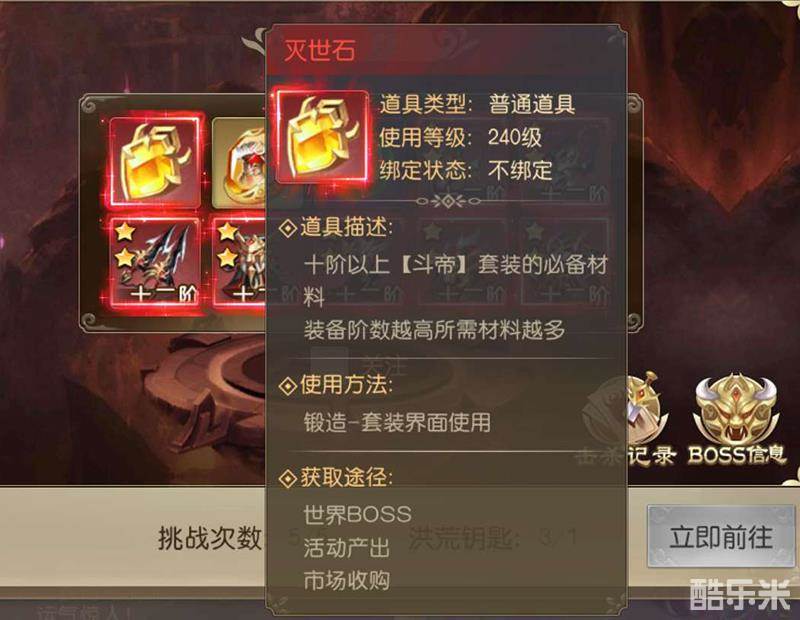 对于新BOSS,我们往往最关心的是奖励内容。与其他玩法类似的是,《灵剑劫》洪荒魔窟同样掉落不同等级的红装和橙装。而除此之外,其主要的产出为套装打造材料——弑神石、斗帝石和灭世石。尤其是灭世石,打造10阶以上装备的高级套装必备材料,在后期的需求量非常大。