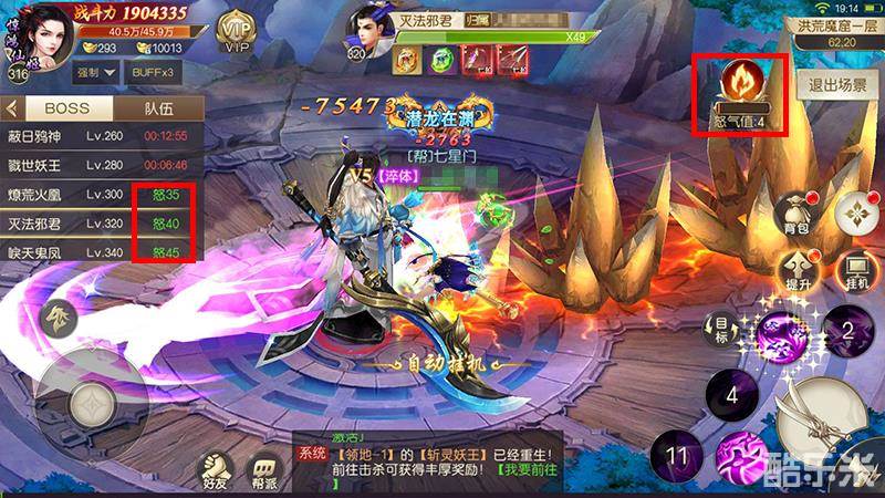 既然是新BOSS,不妨来看看有什么新花样。全新的洪荒魔窟副本新增了“怒气”机制——我们进入副本的怒气初始值为0,击杀任意BOSS或小怪都会增加一定的怒气,而且在副本场景内每分钟都会自然增加怒气,当怒气达到100则会被强制退出副本。显而易见,在该副本中怒气的分配尤为重要,比如先从低等级BOSS(消耗怒气少)开始挑战会是一个不错的选择。
